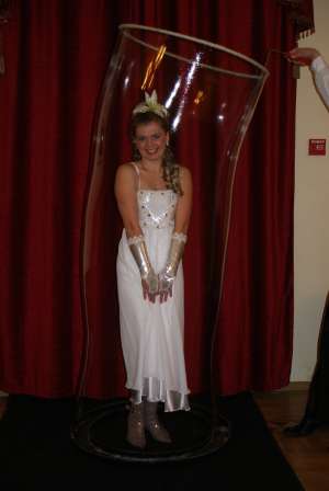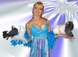фокусы с появлением и исчезновением больших голубей павлинов,плюшевой шиншилы ,а так же веселые интерактивные трюки со зрителем.