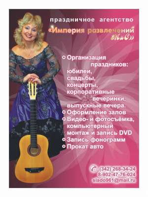 Праздничное Агентство «Империя развлечений МиС» работает в шоу-бизнесе около 10 лет и предлагает организациям и жителям города Перми помощь в организации и проведении культурно-массовых мероприятий. Концерты, презентации, корпоративные праздники, новогодние вечера, юбилей, свадьбы—это не полный спектр услуг. Фото и видеосъемка, оформление зала, фейерверки и салюты, прокат лимузинов и автобусов, оформление свадебного кортежа — все для наших клиентов! Агентство «Империя развлечений МиС» поддерживает тесные и дружеские контакты со многими творческими коллективами города. По желанию заказчика ваш праздник украсят яркие номера любых жанров. Восточные танцы, фокусы, пародии, клоунада, йога, цирковые номера, брейк-дансинг, стриптиз-шоу, шоу-балет, цыганские коллективы— мы удовлетворим пожелания каждого клиента. С творческими и организаторскими способностями компании знакомы многие предприятия и организации города Перми и Пермского края. В штате Агентства профессионалы своего дела, выпускники ПГИИК, режиссеры, сценаристы, ведущие, имеющие богатый опыт проведения праздниковЗвоните, пишите нам. Всегда будем рады найти, в вашем лице, своих новых друзей, и надеемся на дальнейшее сотрудничество!