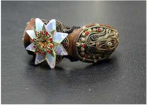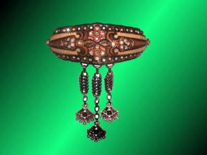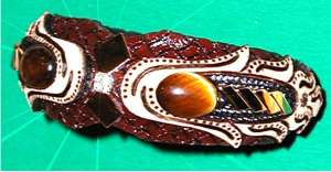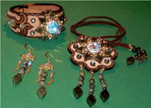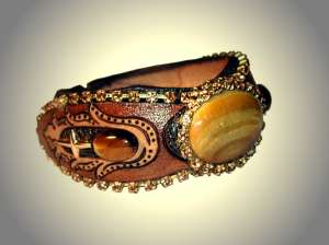 Украшения из натуральной кожи, отделанные металом, поделочными камнями, ювелирными вставками, с магнитными или медными лечебными контурами. Используются собственные технологические разработки в формовании и тиснении.