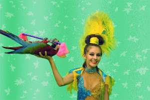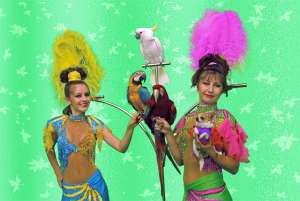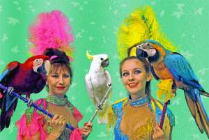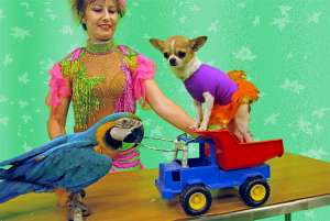 Номер с дрессированными попугаями всегда вызывает восторг у зрителей и является ярким зрелищим любой шоу программы.Наши попугаи Лёлик, Муша и Кеша выступали на детской ёлке в мэрии, ради дружных аплодисментов,пернатые готовы были совершать головокружительные трюки без устали целый день.Попугай Муша с радостью везёт на тележке маленькую собачку Пулю, Лёлик несёт в клюве мячик и складывает его в корзину, Кеша танцует на барабане и крутит палочку антипод.