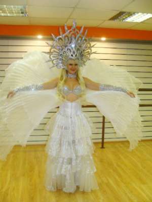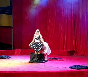 Трансформация костюмов (смена 10 костюмов у девушки и 3 у мужчины), фокус с пиджаком - девушку завязывают туго веревкой и отправляют в одну ширму с мужчиной в пиджаке (случайный зритель), через несколько секунд пиджак оказывается на девушке,а она все также завязана.