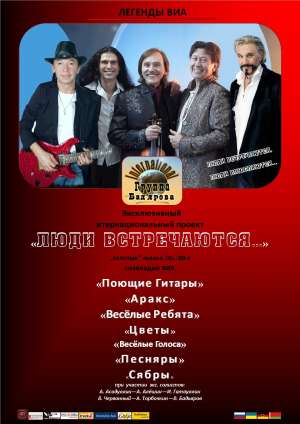 Валентин Бадьяров и его друзья "ЛЮДИ ВСТРЕЧАЮТСЯ…" Эксклюзивный интернациональный проект, при участии солистов и музыкантов  голосов легендарных ВИА:"Аракс", "Поющие Гитары", "Веселые Ребята", "Песняры", "Сябры", "Группа В. Бадьярова“. Уже давно стали классикой популярные мелодии ВИА и исполнители 70-80 г.г., на которых выросло несколько поколений слушателей. Многие из них еще и сейчас звучат актуально, трогая душу буквально классической красотой, нежностью и гармонией. Они и сегодня способны волновать и радовать сердца людей своим неповторимым звучанием. Мы хотим подарить слушателям минуты радости и удовольствия новой встречей с давно полюбившимися прекрасными мелодиями тех лет, a также с авторами и с солистами, в чьём исполнении они впервые прозвучали, что для публики особенно интересно и привлекательно. А так же, вашему вниманию предлагается много новых, интересных композиций, написанныx музыкантами коллектива. Эта музыка вновь жива! Она вернулась! МЫ БУДЕМ ЖДАТЬ ВАС НА ВСТРЕЧЕ С ВАШИМИ ЛЮБИМЫМИ ПЕСНЯМИ!
